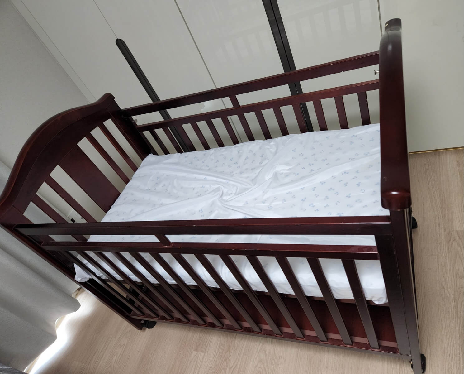 신생아 때는 침대에서 보내는 시간이 많기 때문에 태열 관리를 위해서라도 사방이 뚫려있는 원목 침대가 좋습니다.