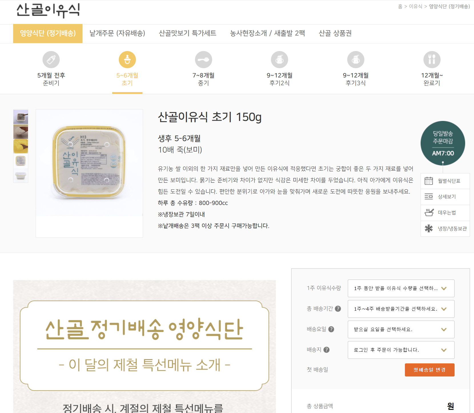 산골 이유식 사이트에 방문하면 이유식 식단을 정기배송 주문할 수도 있고, 낱개로 주문할 수도 있어요.