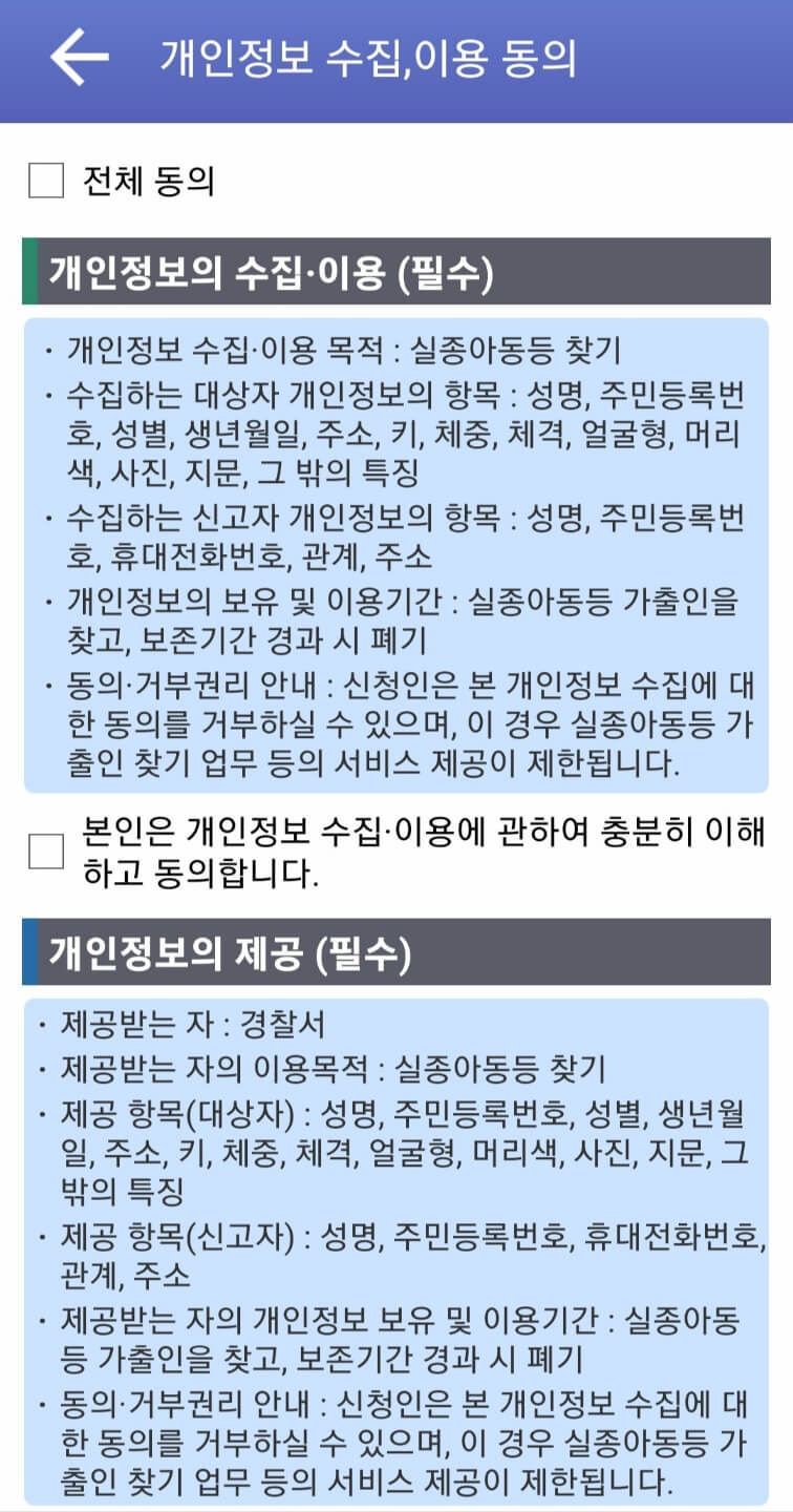 내용을 확인하신 후, 확인버튼을 누르시고 개인정보 수집이 필요하기 때문에 개인정보 수집에 대한 동의도 필요합니다.