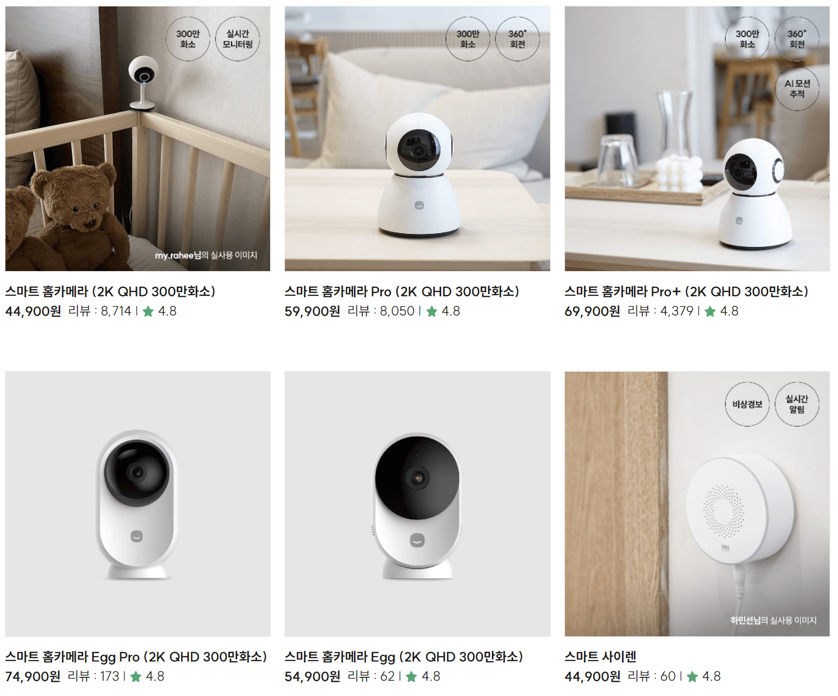 아래는 실제로 헤이홈 홈페이지에 가면 확인할 수 있는 홈카메라 제품 종류입니다.